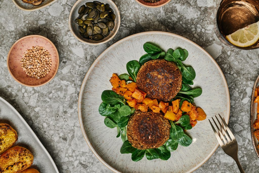 Gekeimte BIO Buchweizenbratlinge mit Süßkartoffel-Kürbisgemüse