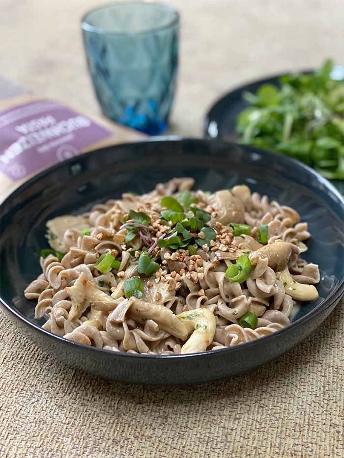Gekeimte BIO Buchweizenpasta nach Verpackungsanleitung garkochen (3-5 Minuten). Kurz bevor die Nudeln gar sind, 100 ml Nudelwasser zu den Pilzen geben, kurz aufkochen. Fettuccine tropfnass in die Sauce geben, gut umrühren und einen Augenblick ziehen lassen. Petersilie hacken. Pasta mit Petersilie und Hefeflocken garnieren und servieren.