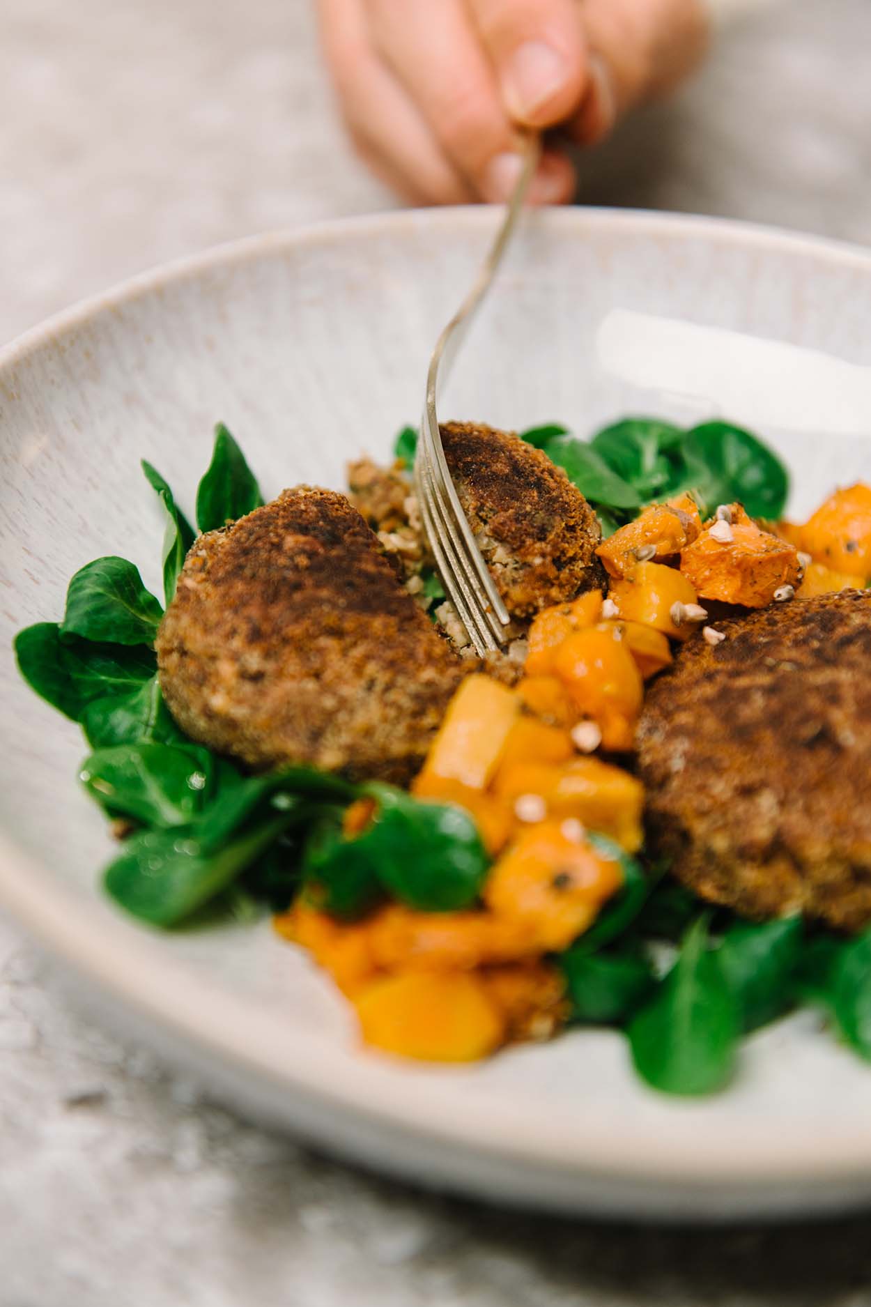 Die Bratlinge in etwas Öl von beiden Seiten goldgelb anbraten und mit Süßkartoffelpüree und frischem Vogerlsalat servieren.