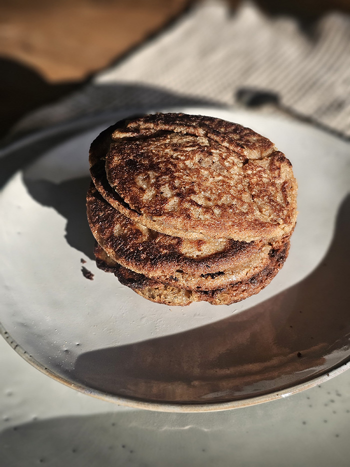 Je Pancake 1/2 Schöpfkelle des Teiges rund in die Pfanne geben (nicht schwenken!) und bei mittlerer Hitze 3 Minuten pro Seite goldbraun ausbacken.
