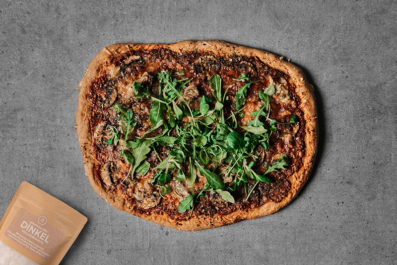 Den fertigen Teig auf zwei Bleche verteilen und dünn ausrollen. Mit der Gabel etwas einstechen. Die Pizza nach Belieben belegen und dann 30 Min. auf 200 Grad Umluft ausbacken.