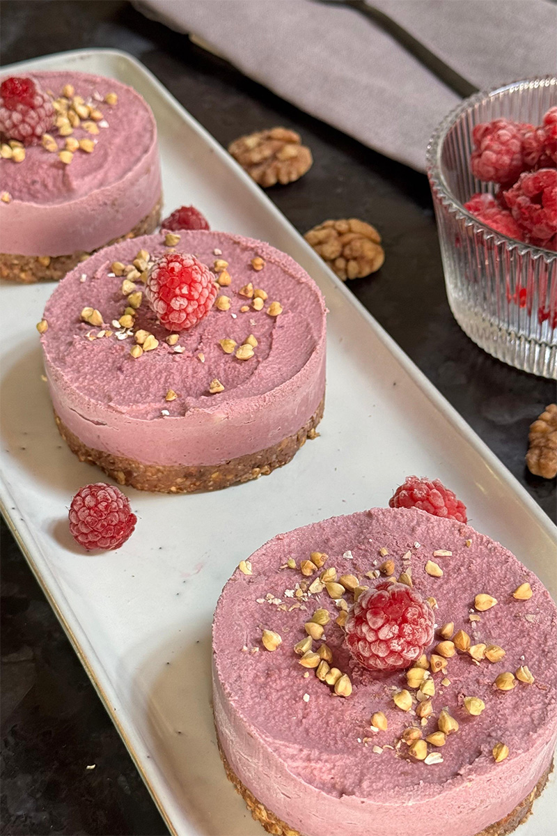 Alle Zutaten für den Boden in einer Küchenmaschine hacken. Anschließend in 3 Dessertringe aufteilen und mit den Fingern gut andrücken. Die Zutaten für die Himbeer-Masse in einem Mixer fein pürieren. Die Masse auf die „Törtchenböden“ geben und glattstreichen. Mindestens 30 Minuten kühl stellen. Dessertringe anschließend vorsichtig abheben. Himbeeren waschen und als Topping auf die Desserttörtchen legen, mit gekeimten Bio Buchweizen für den extra Crunch bestreuen.