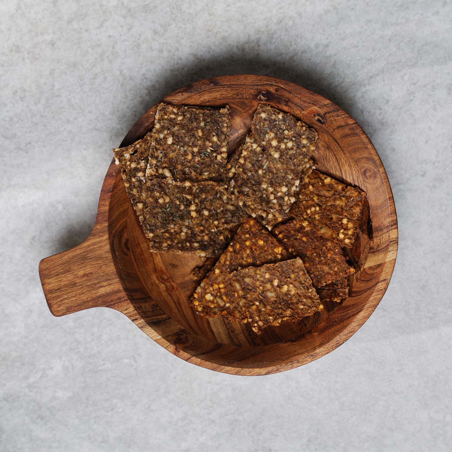 Heize den Ofen auf 150°C Ober- und Unterhitze vor. Vermische die gekeimte NUEA Energiebrotmischung mit den restlichen trockenen Zutaten in einer Schüssel. Mische das Wasser hinzu und lasse die Masse 15 min stehen. Streiche die entstandene Masse auf ein Backpapier. Verteile den Teig gut bis an den Rand, sodass er an allen Stellen etwa gleich hoch ist. Das ist wichtig, damit er später an allen Stellen schön knusprig ist.
